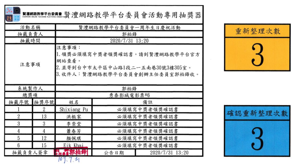 1.領獎必須填寫中獎者領獎確認書,請到賢灃網路教學平台官方網站查看。